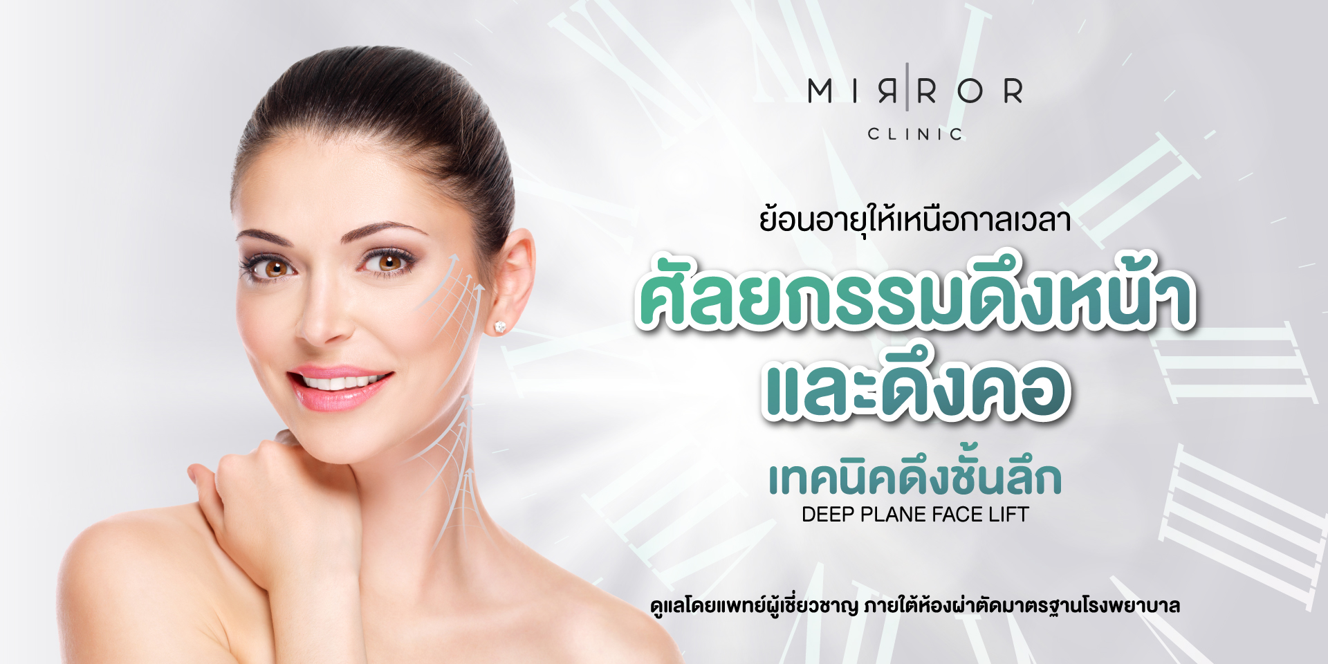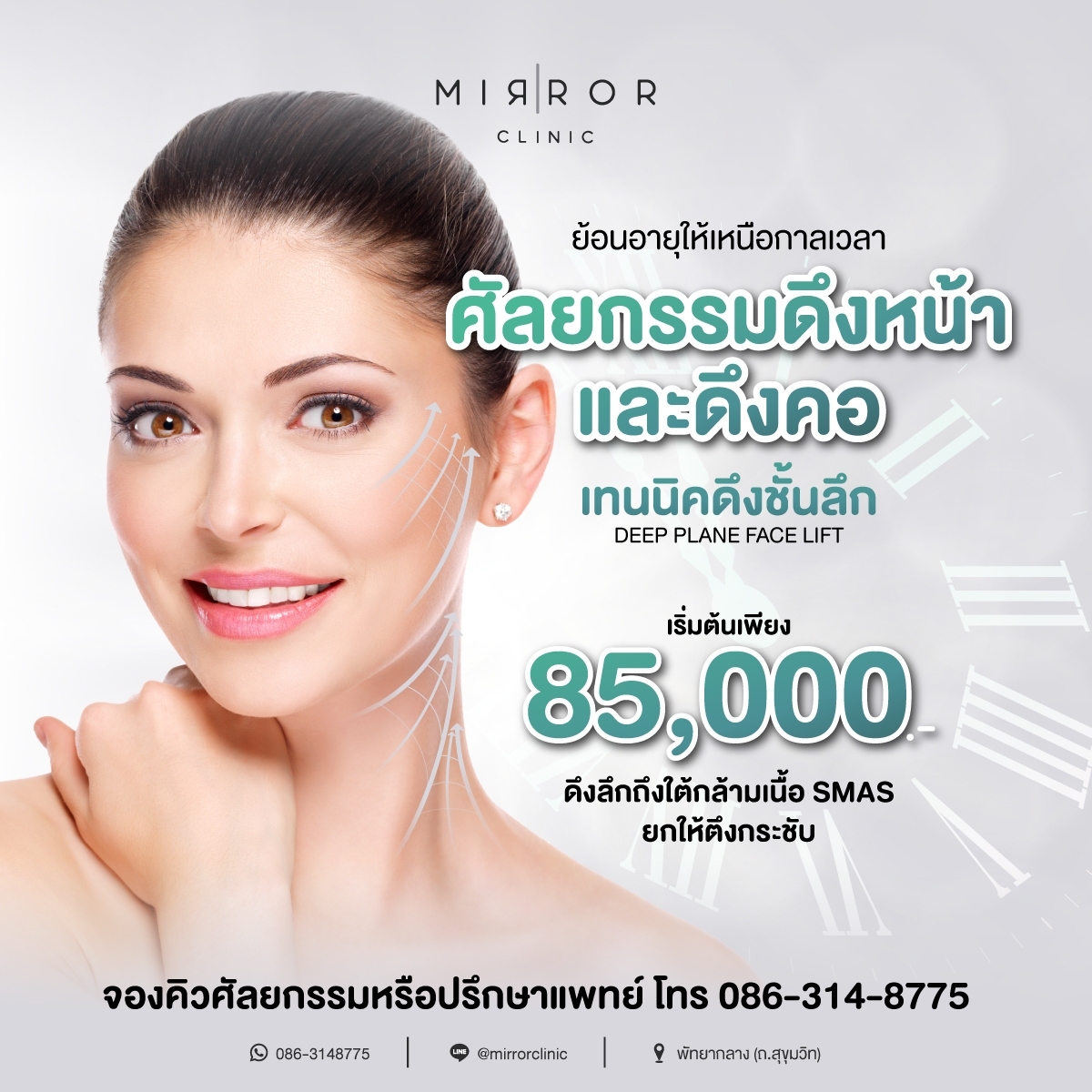 ที่มิเรอร์คลินิกเป็นการผ่าตัดดึงหน้าดึงคอเทคนิคใหม่ล่าสุดแบบ DEEP PLANE FACE LIFT คือ การดึงหน้าแบบลึกถึงใต้ชั้นกล้ามเนื้อแสมซ โดยวิธีนี้สามารถเข้าไปกำจัดผิวหนัง เนื้อเยื่อไขมัน และเนื้อเยื่อชั้นสแมซ ที่เสื่อมสภาพ